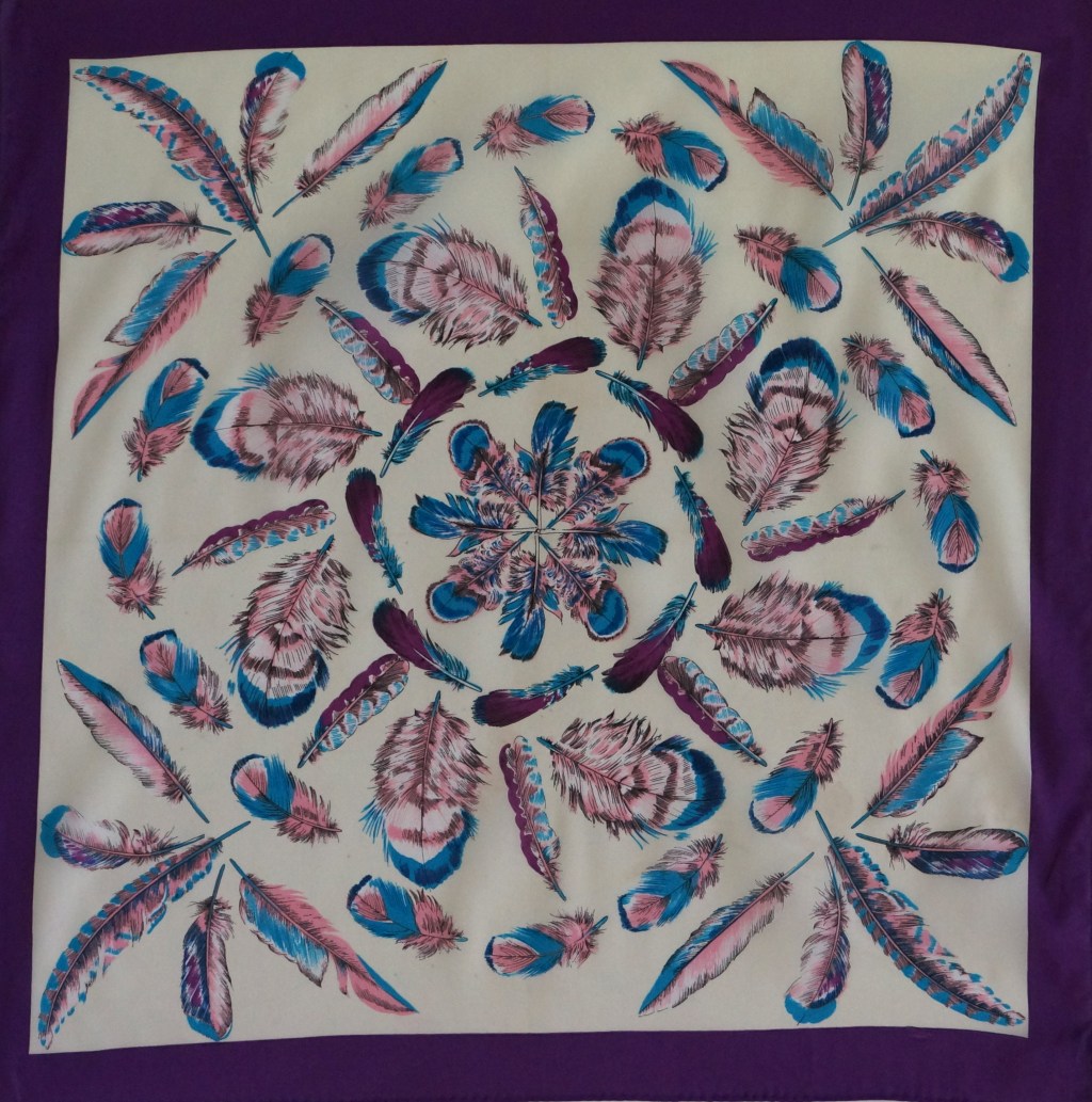 This scarf is from my collection – it has no fancy pedigree or label. I simply love the design and color combination. Feathers have been a popular motif throughout the decorative arts: from textiles to carpets to dinnerware. This design features a central octagonal group of feathers surrounded by several rows of feathers radiating out in different formations and angles. The use of the deep turquoise blue combined with pink and purple is majestic, unexpected and very stylish.