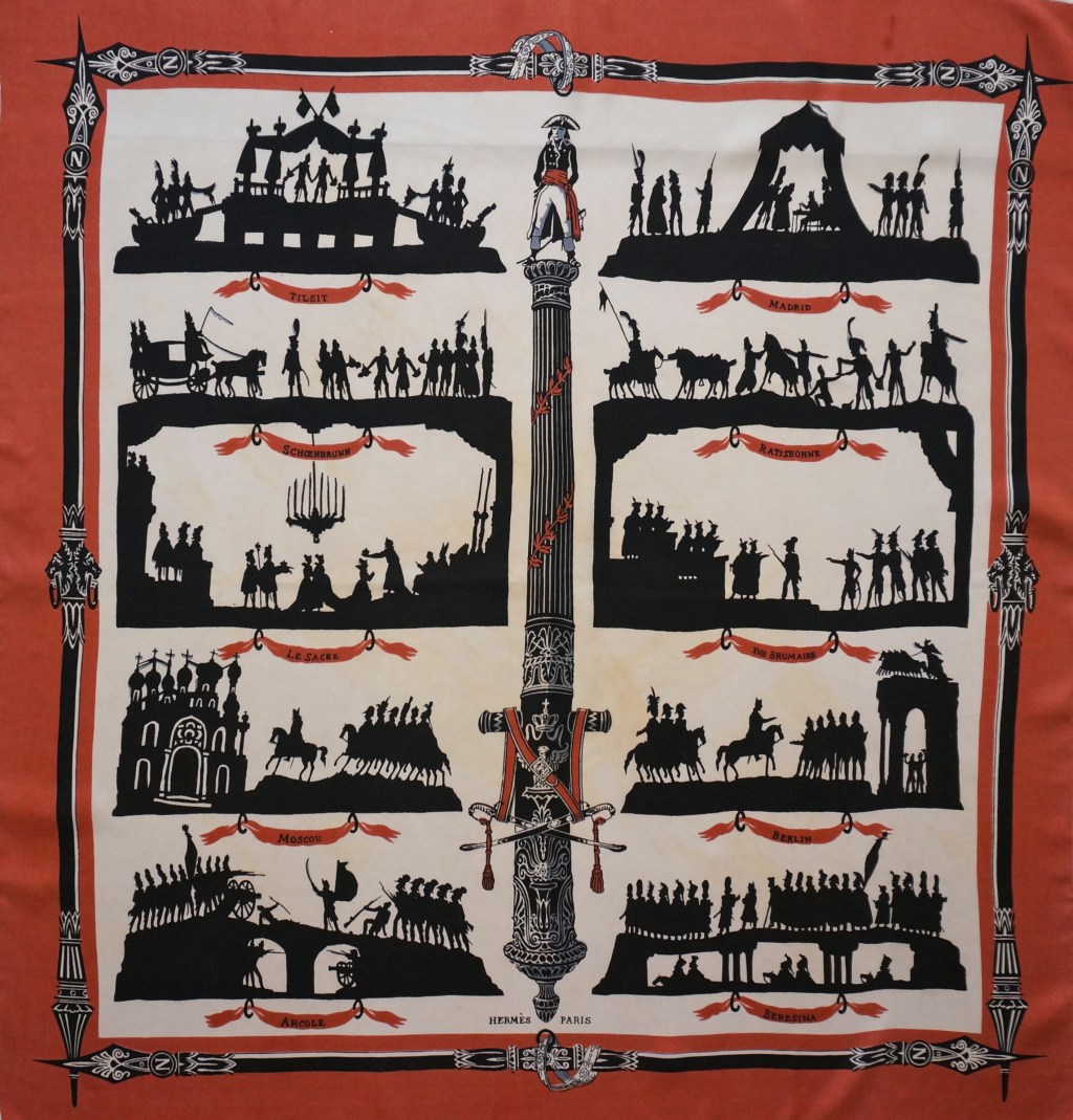This is a Hermes scarf titled “Victoires et Scenes Militaires de la Vie de Napoleon” (“Military Victories and Scenes From Napoleon’s Life”). It was designed in 1949 by Hugo Grygkar who is credited with creating the very first scarf that Hermes produced (in 1937). Grygkar is called “the father of the Hermes scarf” and he was Hermes’ most prolific artist, producing over 100 designs. He did not sign his work. In addition to designing scarves for Hermes, Grygkar was an illustrator for Vogue and other magazines. He later became the primary designer for the Hermes fashion house.