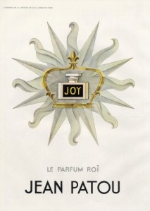I have read that a silk scarf was included with the perfume in its early days. I would like to think it was this design but I have no idea if it dates back as far as that. However I do have several vintage bottles of Joy, all inherited from my grandmother. I have to guess that Joy was a favorite of my grandmothers since there are so many bottles between my mother and I. The bottle and label are examples of chic simplicity. The vintage advertisements are also lovely, here are a few examples: