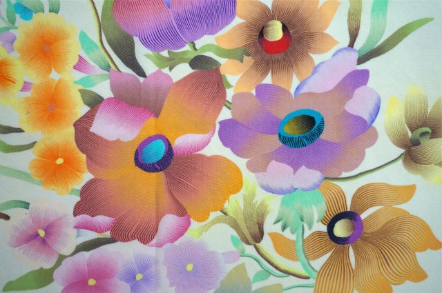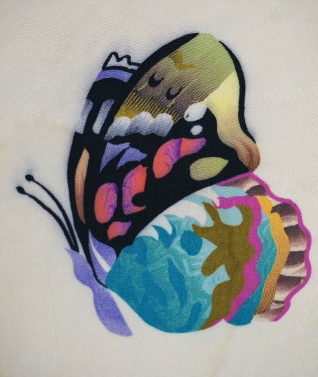This beautiful vintage silk scarf is a recent find from my mother. It was stored away in someone’s attic for years. It has no label or signature so I have no identification on the designer or manufacturer. The colors are so lush and at the same time so soft. The artwork in the butterflies is really unique as is the fine line work in the flowers.