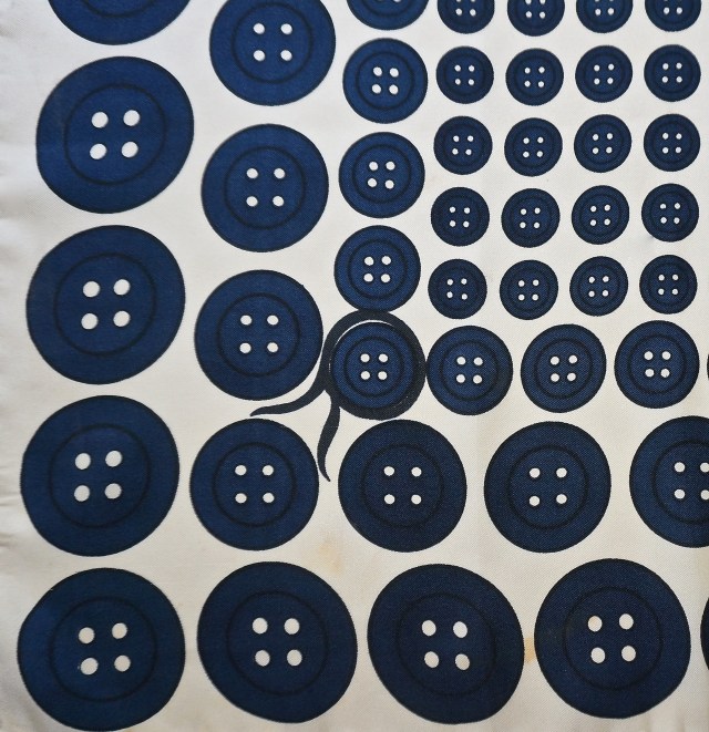 Another great vintage find featuring a charming layout of buttons. On close inspection I discovered the “R” signature or logo cleverly framing a button in the corner. I’ve been doing some research to try to identify the “R” to no avail – if anyone knows the designer of this scarf please let me know!