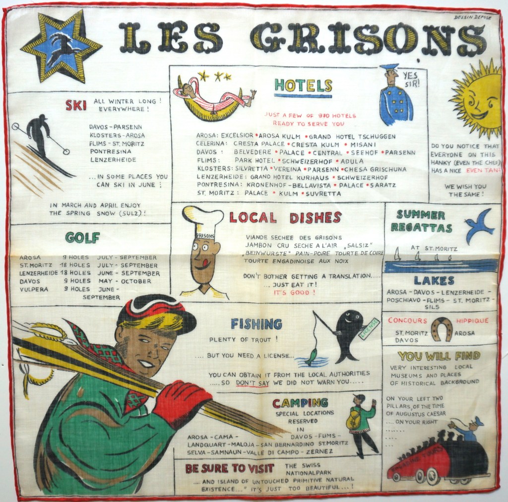 This handkerchief lists Swiss attractions for sports such as skiing, golf, and camping with some words of advice. Beneath a list of local dishes in French it says “don’t bother getting a translation…just eat it!”