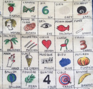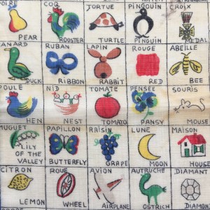 This 1950’s handkerchief is a fun guide to the french and english words for a variety of things. Featuring charming hand drawn illustrations of an array of animals, colors, and symbols. I especially love the little faces.