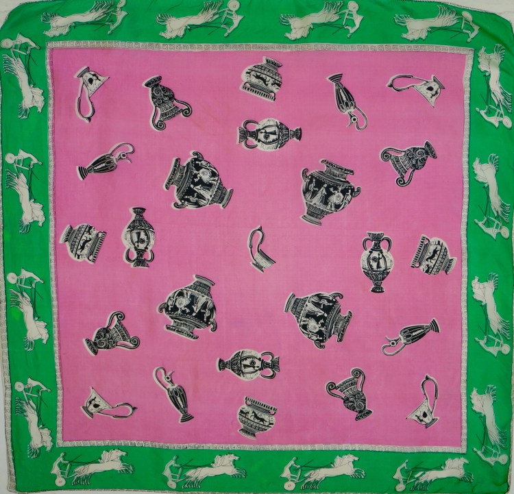 Since it seems everyone is traveling the Greek islands this summer I thought this vintage scarf was appropriate! I love the pink and green combination – it’s a preppy interpretation of classic Greek motifs.