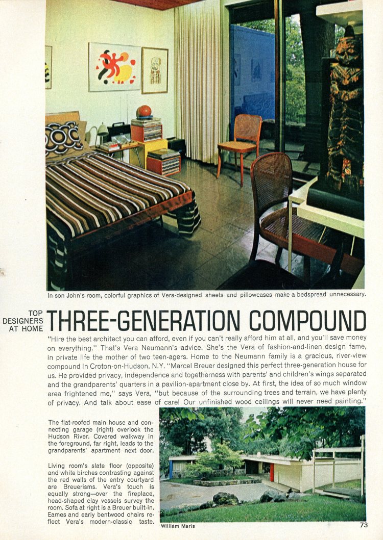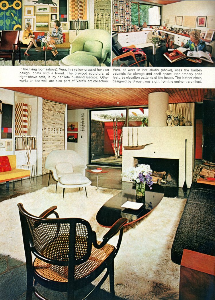 I first saw these images in Susan Seid’s book “Vera The Art and Life of An Icon.” I tracked down a copy of the 1970 American Home Magazine in which they first appeared in as part of a profile of “Top Designers at Home.” Vera and her husband commissioned Marcel Breuer to design the house in the Hudson Valley of New York in the early 1950’s. The house was named “Finney Farms” and was near Vera’s screen printing factory in Ossining.