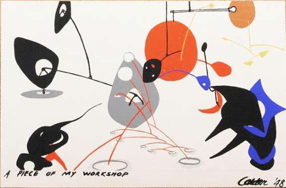 In 1949 Calder installed a mobile in the studio of artist Erwin Laverne in New York. Laverne and his wife Estelle formed Laverne Originals to produce and sell fabrics and wallpapers (and eventually furniture). Inspired by visiting the couple’s studio and seeing the wallpapers on view, Calder asked if he could create a wallpaper design for the company.