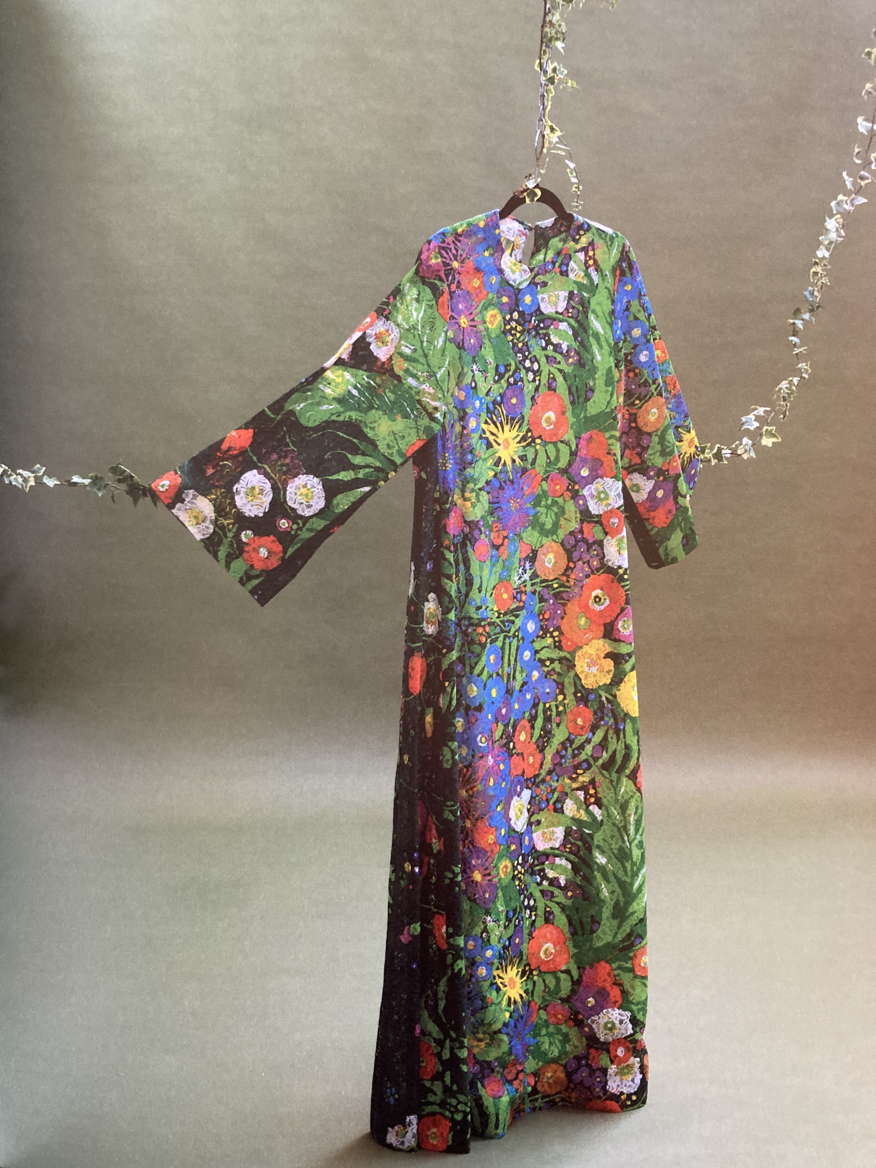 Ken Scott had a rich and storied life, starting out as a painter and then finding much success as a fabric designer before delving into fashion. An American, he lived his adult life primarily in Italy and Mexico, hobnobbing with the likes of Peggy Guggenheim. His fashions were modeled in the pages of Vogue, Harpers Bazaar, and Life Magazine by women such as Audrey Hepburn, Monica Vitti and Brigitte Bardot (to name only a few). But in this post I’m primarily interested in sharing and promoting images of the work, not delving into the details of his life & career, except to also bring attention to Susan Nevelson. Nevelson worked as a print/pattern designer for Scott for over 50 years. It is difficult to discern how many of the designs were painted by Scott versus Nevelson based on what I have read, but I get the sense that Ken Scott “the brand” would not be Ken Scott without Susan Nevelson.